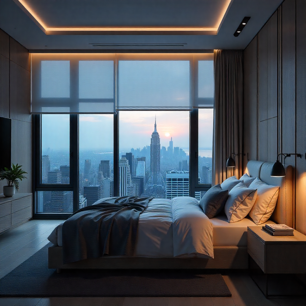 Sleek master bedroom with barrier-free access, wider doorways, and integrated smart home technology for accessibility, illuminated by the warm glow of a spring afternoon.